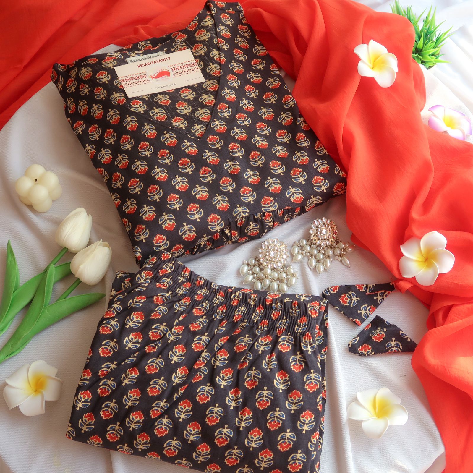 Introducing our exquisite “Black Rose ” Three-Piece Suit Set, a manifestation of timeless elegance and refined sophistication. The kurta, in a rich dark blue hue, becomes a canvas for a breathtaking array of off-white and brownish flowers, delicately printed to create a harmonious fusion of color. The V-neck design is adorned with intricate flower embroidery along the borders, adding a touch of opulence and artistry.
