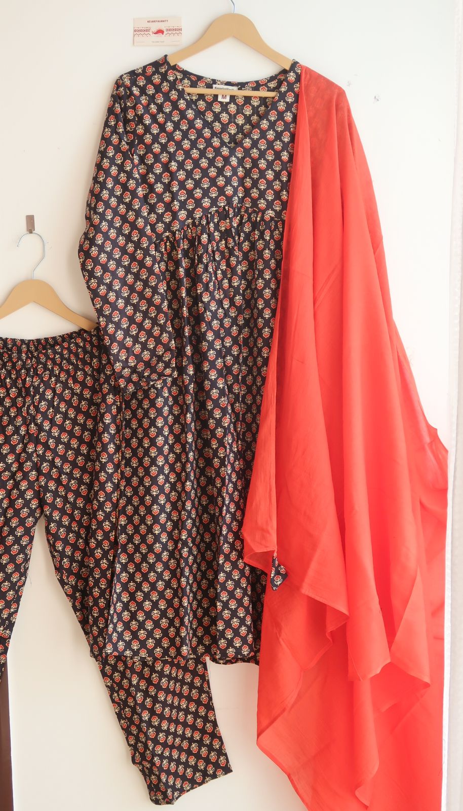 Completing the set is a matching dark blue dupatta, featuring a delicate border adorned with printed flowers. The dupatta adds a layer of grace and completes the ensemble with a touch of traditional charm.