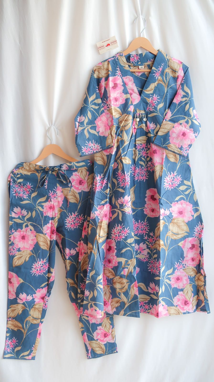 Completing the set are the matching midnight blue pants, adorned with charming flowers and petals prints. These pants add a contemporary and cohesive element to the ensemble, perfectly complementing the floral design of the kurta while maintaining an air of elegance.